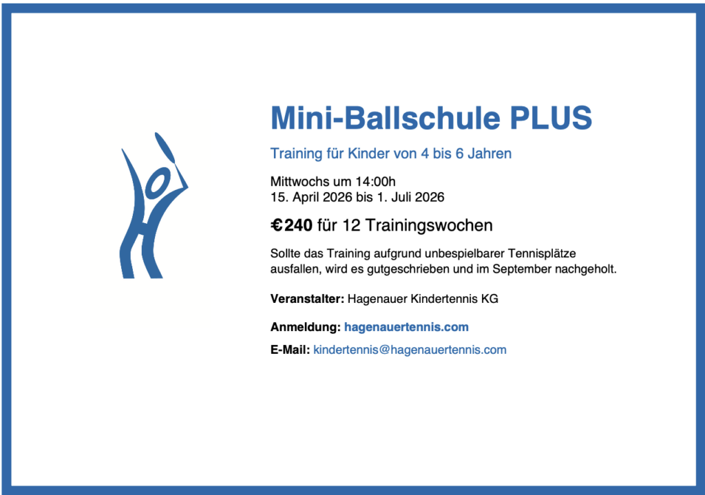 Während der Outdoor-Saison 2026 findet das Trainingsprogramm „Mini-Ballschule“ für 4- bis 6-jährige Kinder in Kooperation mit dem Tennisverein TC Blau-Weiss statt. Die “Hagenauer Kindertennis KG” übernimmt die Organisation und Durchführung des Trainingsprogramms für den TC Blau-Weiss. Die Teilnahme am Trainingsprogramm „Mini-Ballschule“ ist durch eine gültige Mitgliedschaft im TC Blau-Weiss abgedeckt. Hier geht’s zur Anmeldung … [mehr]